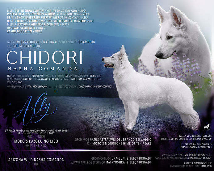 Ally has several close relatives in her maternal line with some of the most prestigious wins in show and highest titles in IGP receiving super scores across the board. Including her great grandsire, World Winner '22 & '25, World Junior Winner '19 MiG IZBB IGP3 (only dog in the world with this combination of titles), great uncle MCH URAL IZBB IGP3, great aunt World Winner and European Winner UM-KA IZBB, grandmother Vice Junior World Winner, National Best in Specialty Show Winner, High in Trial Winner MCH GRCH MATRYOSHKA IZBB...and the forever queen...the one and only triple World Winner, Vice European winner and BBI World Cup Supreme Winner ATAKA IZBB.
